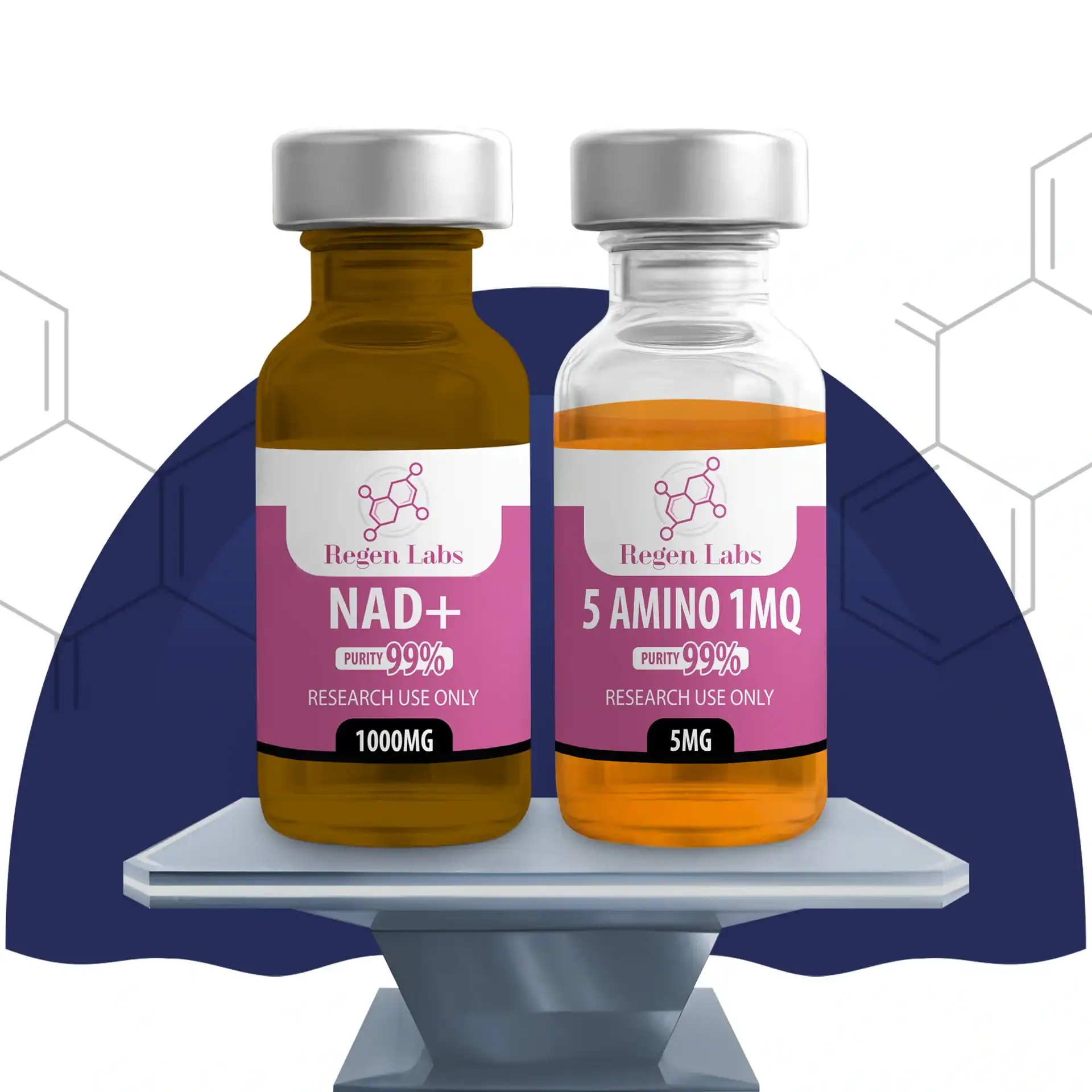 5 Amino 1MQ is a premium grade (99%+ purity) research peptide in lyophilized solid (freeze dried) form. Sealed with a self healing rubber stopper in a 3ml vial under negative pressure. Protected by a plastic and metal cap.
