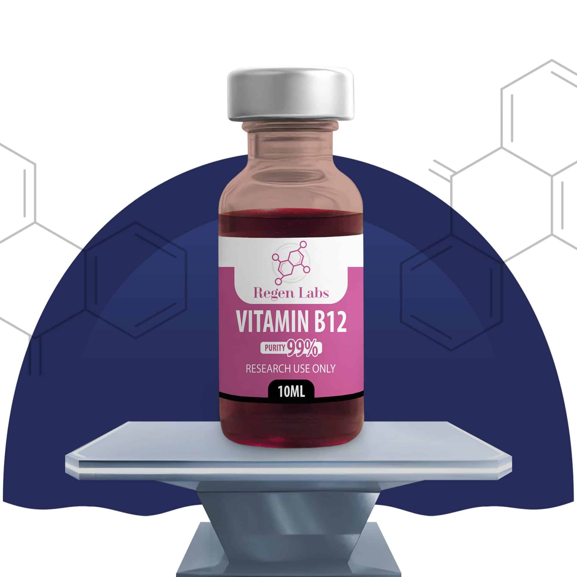 Vitamin B12 is a premium grade (99%+ purity) research vitamin in lyophilized solution (liquid solution) form. Sealed with a self healing rubber stopper in a 10ml vial under normal pressure. Protected by a plastic and metal cap.